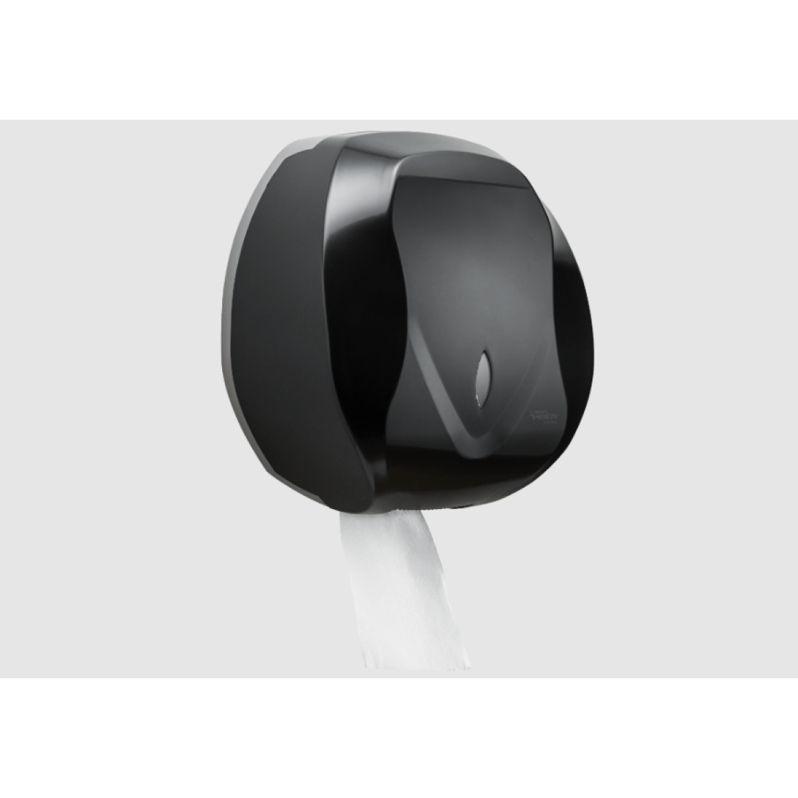 Dispenser preto para papel higiênico tipo rolão de 300 a 500m com serrilhas nas extremidades da saída de papel para facilitar o corte do papel, foi projetado para facilitar o uso de todas as marcas de papel existente no mercado.